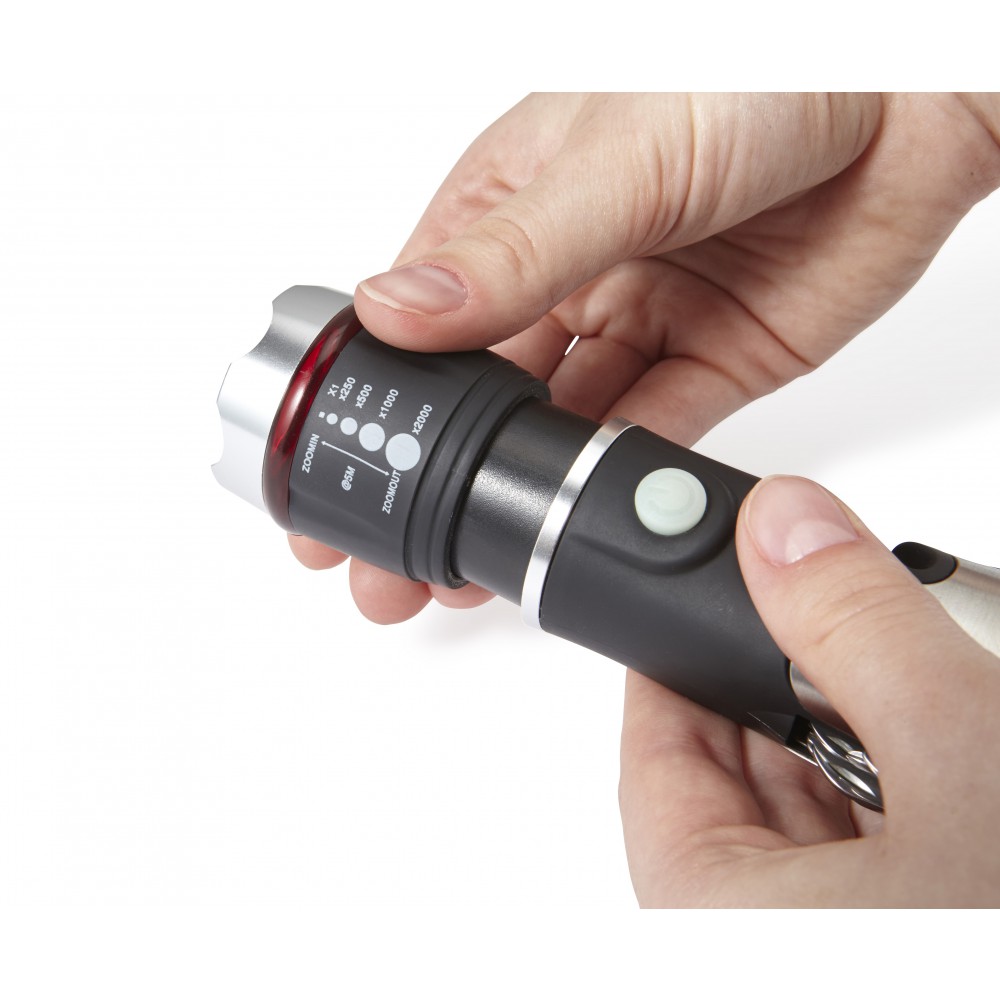 Lámpa biztonságiöv-vágóval, vészkalapáccsal. Az alsó részben kivehető zsebkés teszi igazán multifunkcióssá ezt az eszközt. Az elemet tartalmazza. Fém.