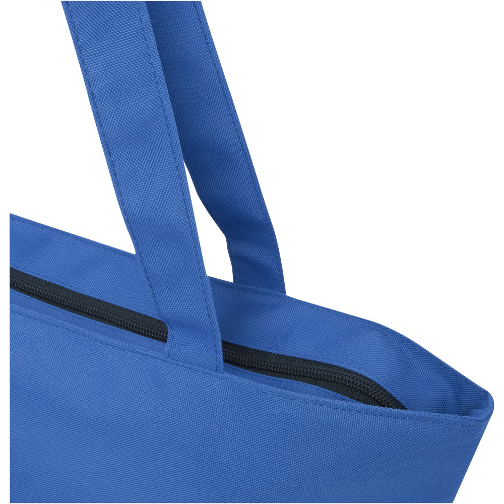 A vízlepergető 600D rPET anyagból készült Panama GRS újrahasznosított cipzáras táska tökéletes és fenntartható választás, ha rendezvényre, strandra vagy bevásárlásra készülsz. Egy cipzáras főrekesszel és egy cipzáras belső zsebbel rendelkezik, amely elég nagy a telefonod vagy más értékes holmi tárolására. Fülei 34 cm hosszúak, ezért a táska könnyen hordozható vállon. Teherbírás: 10 kg. PVC-mentes.