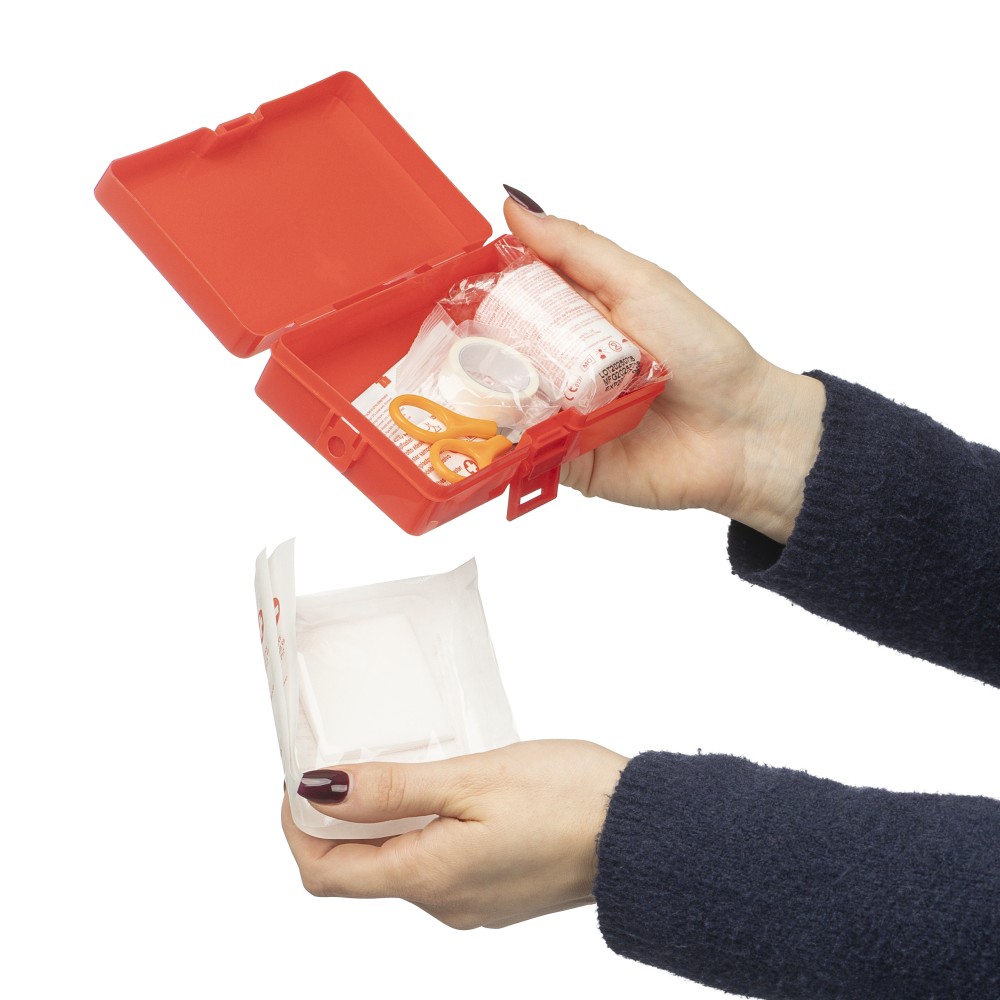 PP anyagból készült elsősegélykészlet piros tokban, a felső részen fehér kereszttel és csatos záródással. Tartalma: 2 nemszőtt törlőkendő, 5 ragtapasz, 4 alkoholos törlőkendő, 1 olló, 1 tekercs 450 cm hosszú gézkötés és 1 tekercs 450 cm hosszú ragasztószalag.