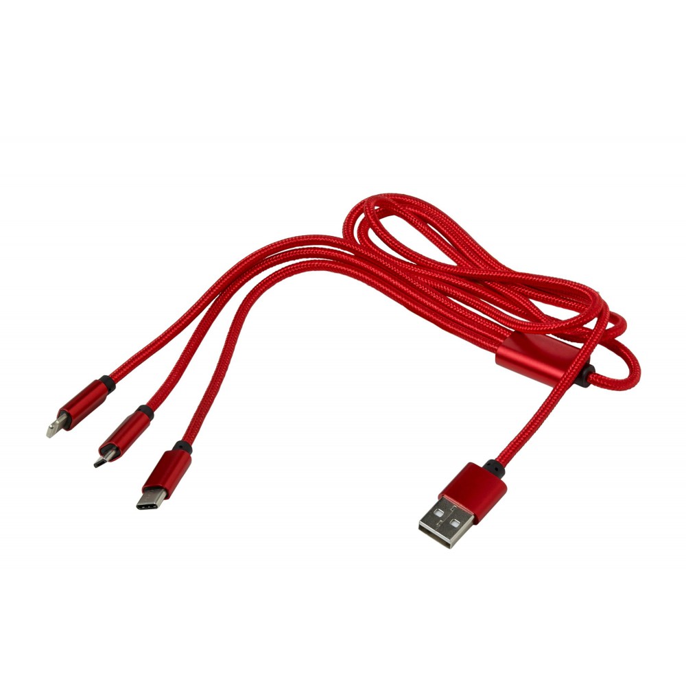 Töltőkábel az egyik végén USB csatlakozóval, a másik végén mikro USB, USB-C és Lightning csatlakozókkal. Nylon.