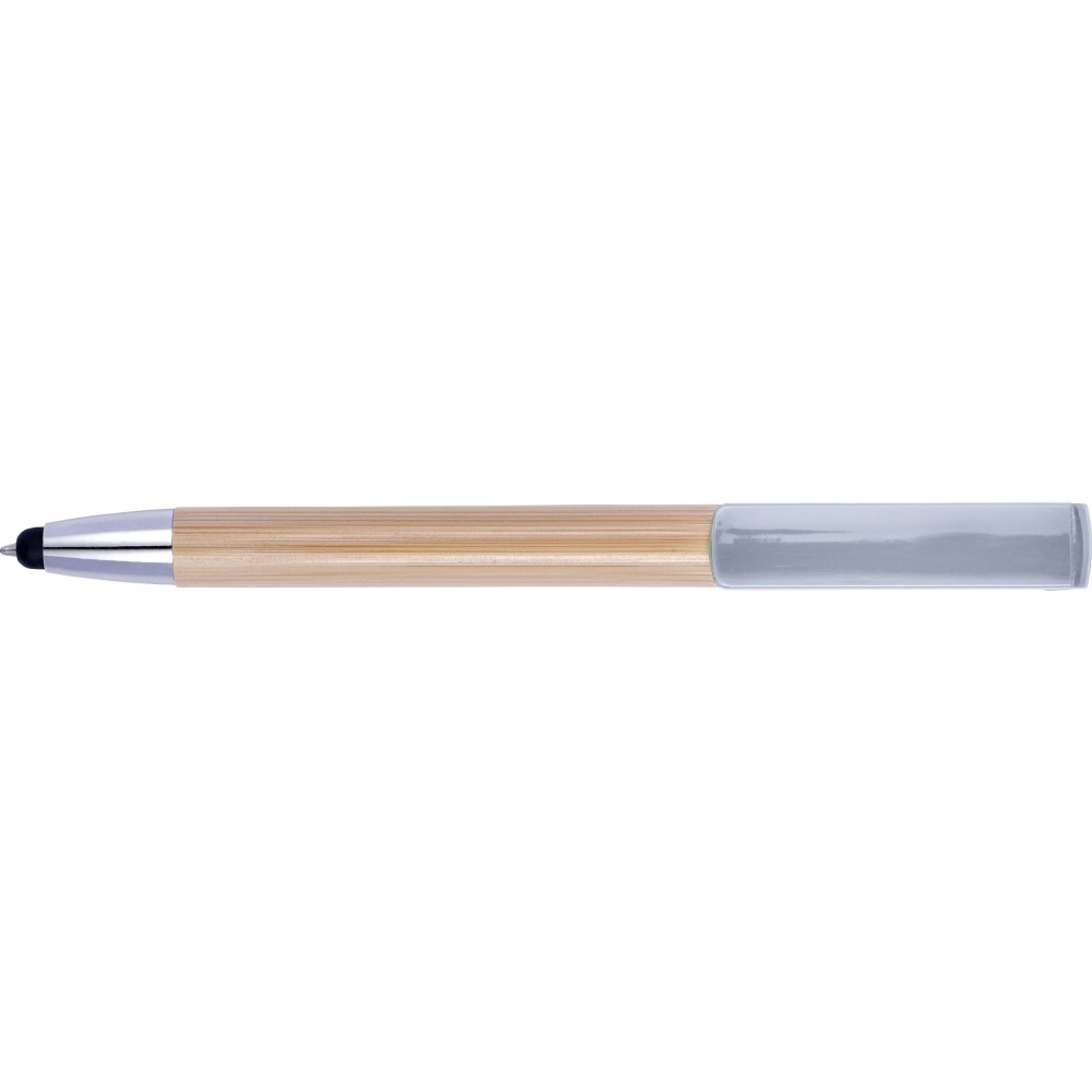 Golyóstoll és érintő kék tollbetéttel, műanyag klipsszel és nyomógombbal. A klipsz nyomógombként funkcionál, és okostelefon-állványként is használható. ABS, bambusz.