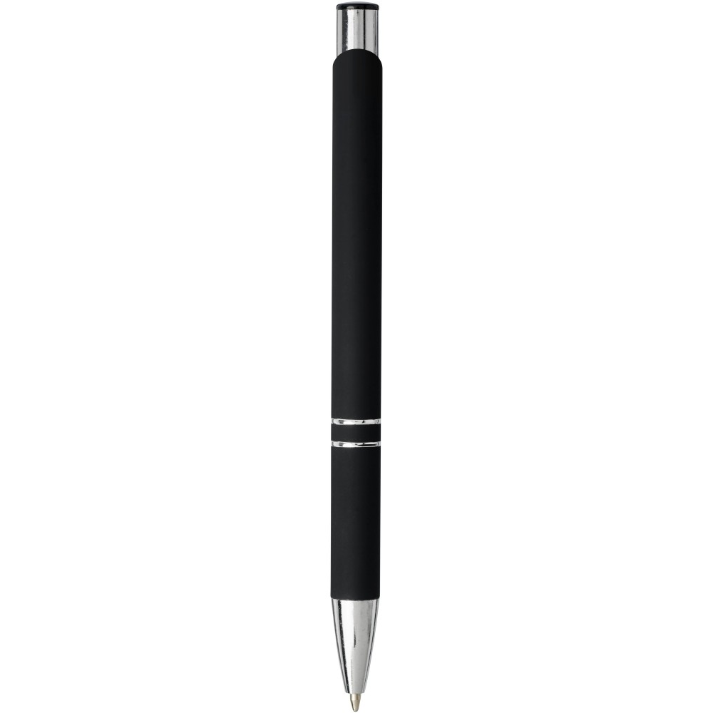 Nyomógombos golyóstoll puha tapintású bevonattal. Lézergravírozáskor megjelenik a toll fényes króm, felület alatti rétege. Fekete tollbetéttel.