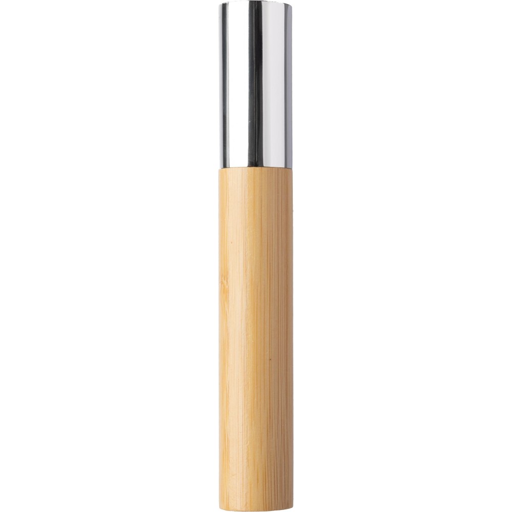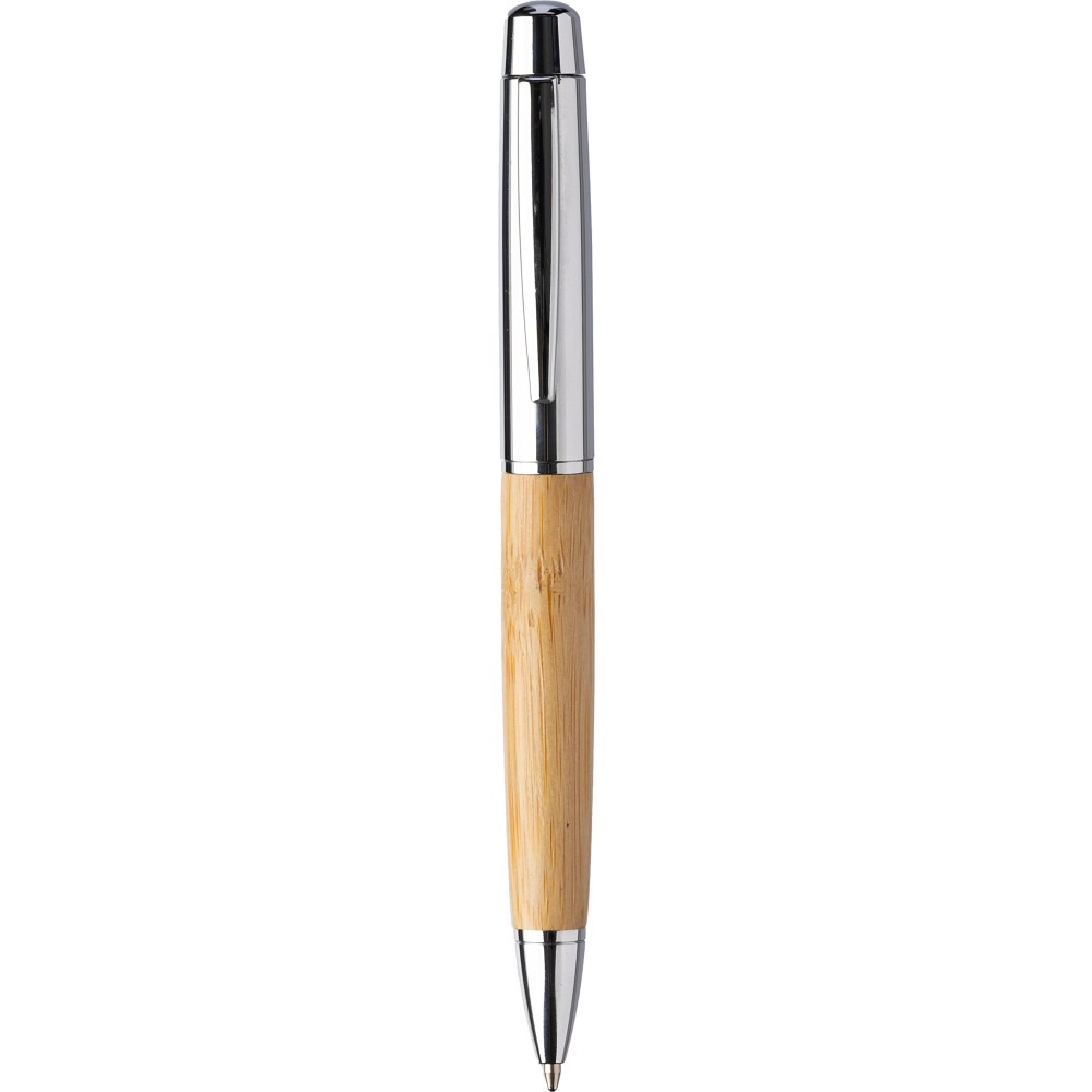 Rozsdamentes acél golyóstoll csavaros mechanikával, bambusz markolattal. Kék színű, fém Parker tollbetéttel. Barna kartondobozba egyedileg csomagolva érkezik.