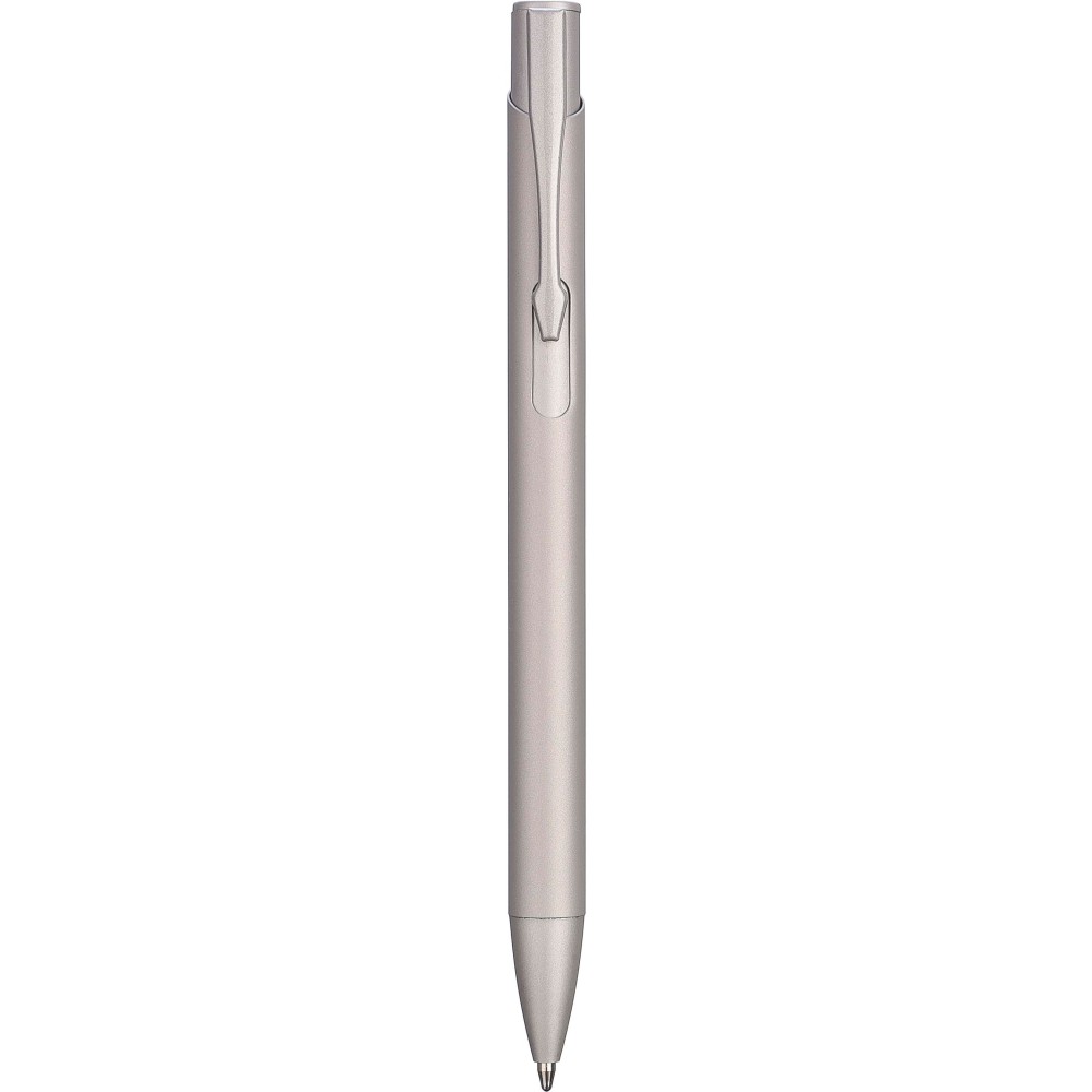 Újrahasznosított alumíniumból készült golyóstoll gumírozott bevonattal a tolltesten. A klipsz, a tollhegy és a nyomógomb azonos színű. A klipsz fémből, a tollhegy műanyagból készült. Kb. 800 méter íráshossz. Gravírozott újrahasznosított alumíniumra utaló logóval. Kék tollbetéttel.
