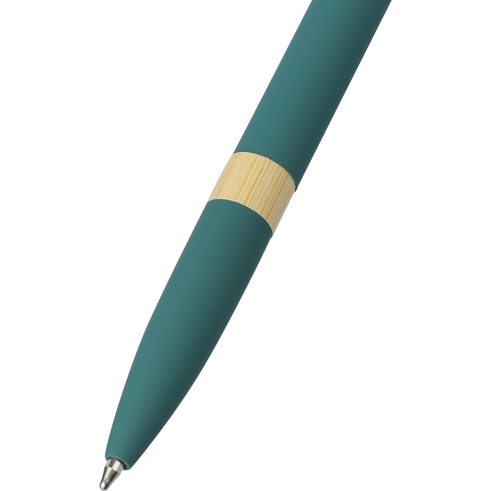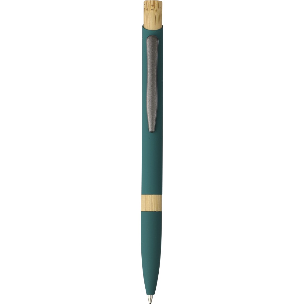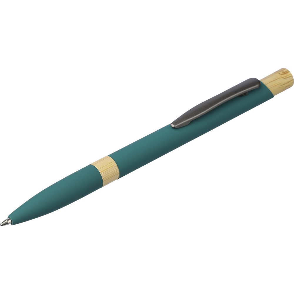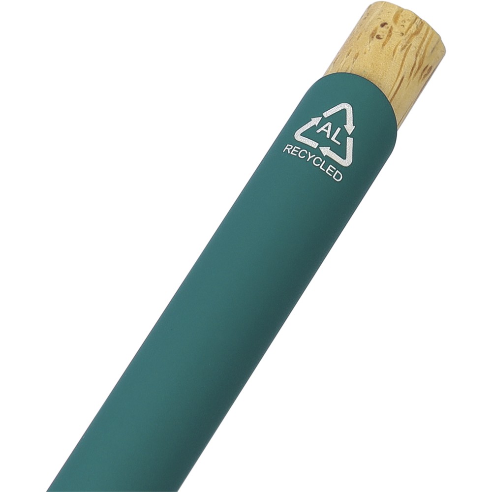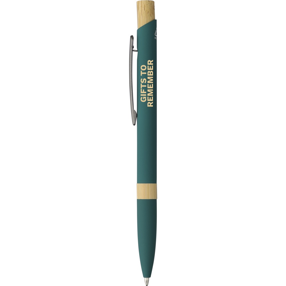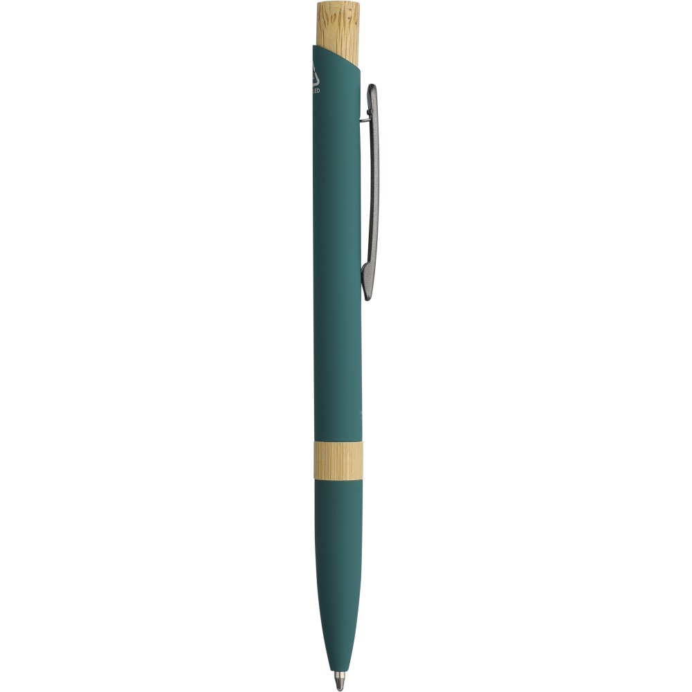 Golyóstoll újrahasznosított alumíniumból, gumírozott bevonattal, bambusz nyomógombbal és bambusz gyűrűvel a tolltesten. Kék tollbetéttel. A tollhegy vastagsága 1.0 mm, íráshossz: kb. 800 méter. Az újrahasznosított anyagra utaló logó a tollra van gravírozva.
