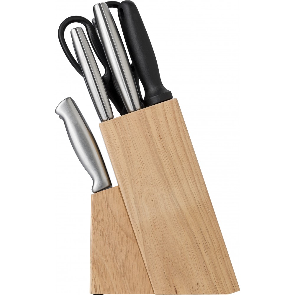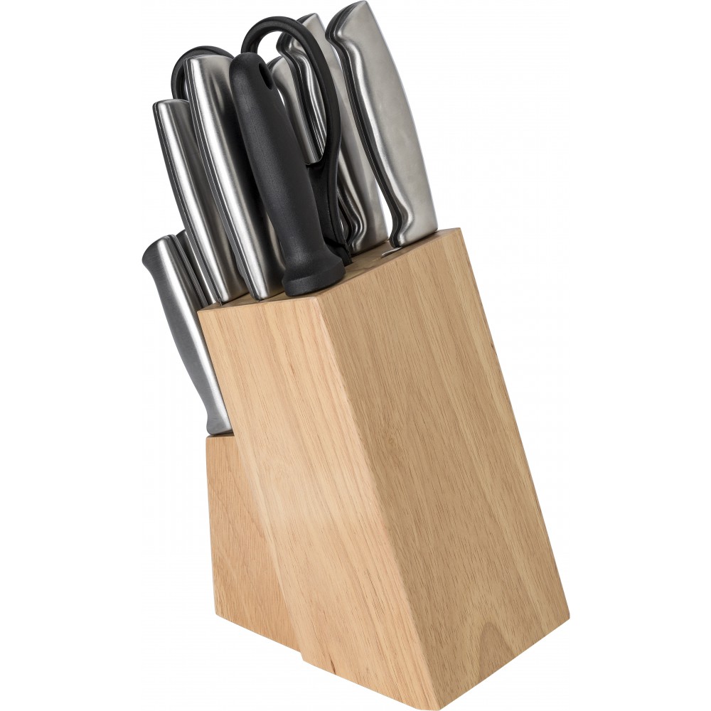 Konyhai készlet rozsdamentes acélból és PP műanyagból. A gumifa talp 13 db konyhai eszközt tartalmaz: olló, élező és különböző kések.