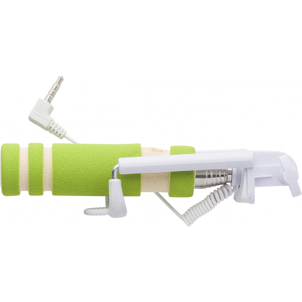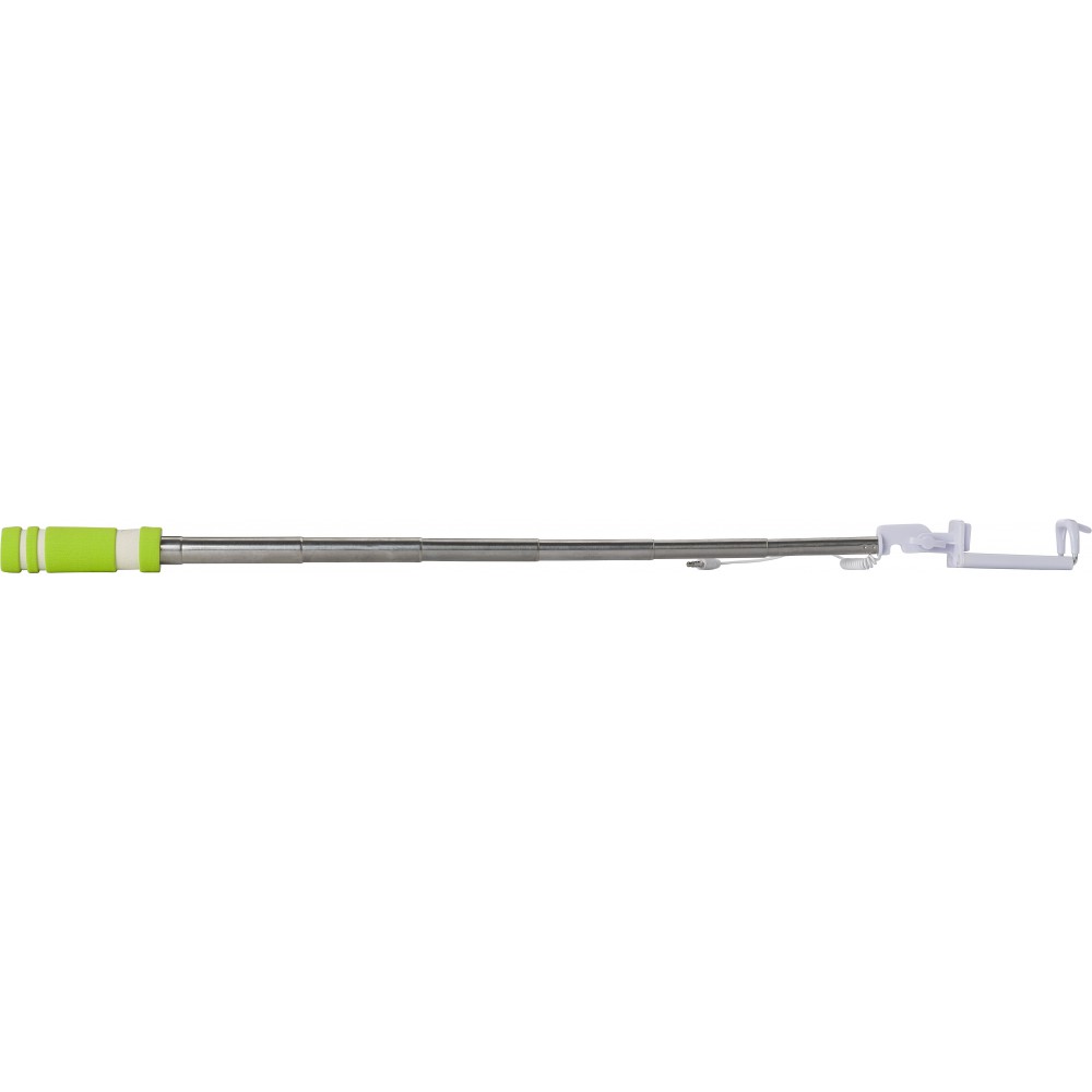 Teleszkópos szelfibot, 61 cm-ig kihúzható nyéllel, EVA hab fogóval, nyomógombbal, kb. 33 cm-es csatlakozókábellel. ABS műanyag.