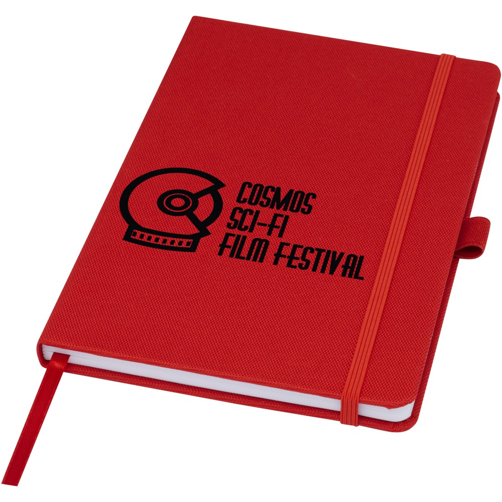 A5 jegyzetfüzet újrahasznosított PET műanyagból készült szövet borítóval. 80 lap 70 g/m2 újrahasznosított, vonalas papír, tolltartó hurok és szalag könyvjelző. Kombinálható a 107757 Honua RPET golyóstollal.