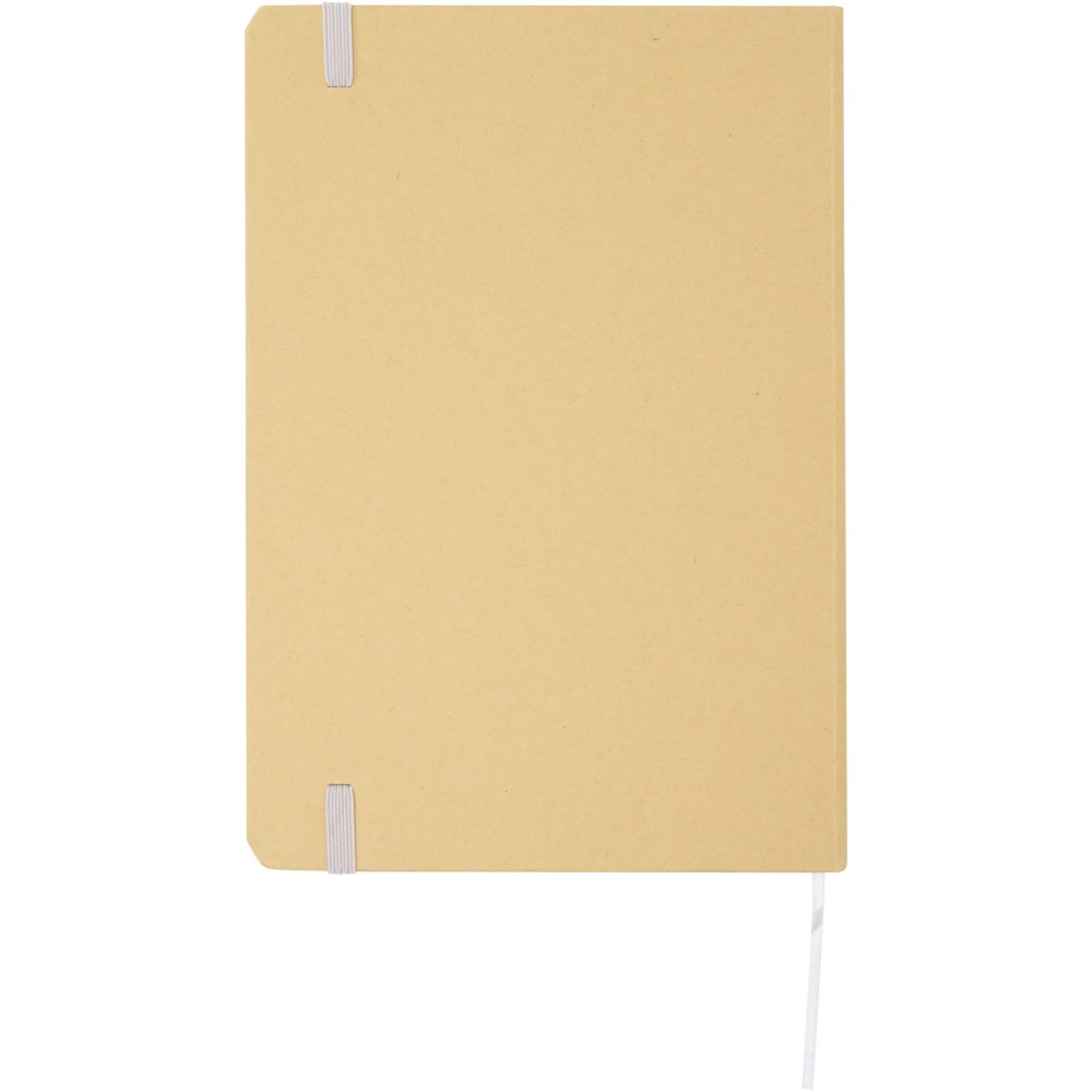 Kemény fedeles A5 jegyzetfüzet újrahasznosított kartonból, 80 soros, 70 g/m2 papírlappal. A jegyzetfüzet gumis záródással, szalaggal és lekerekített sarkokkal rendelkezik.