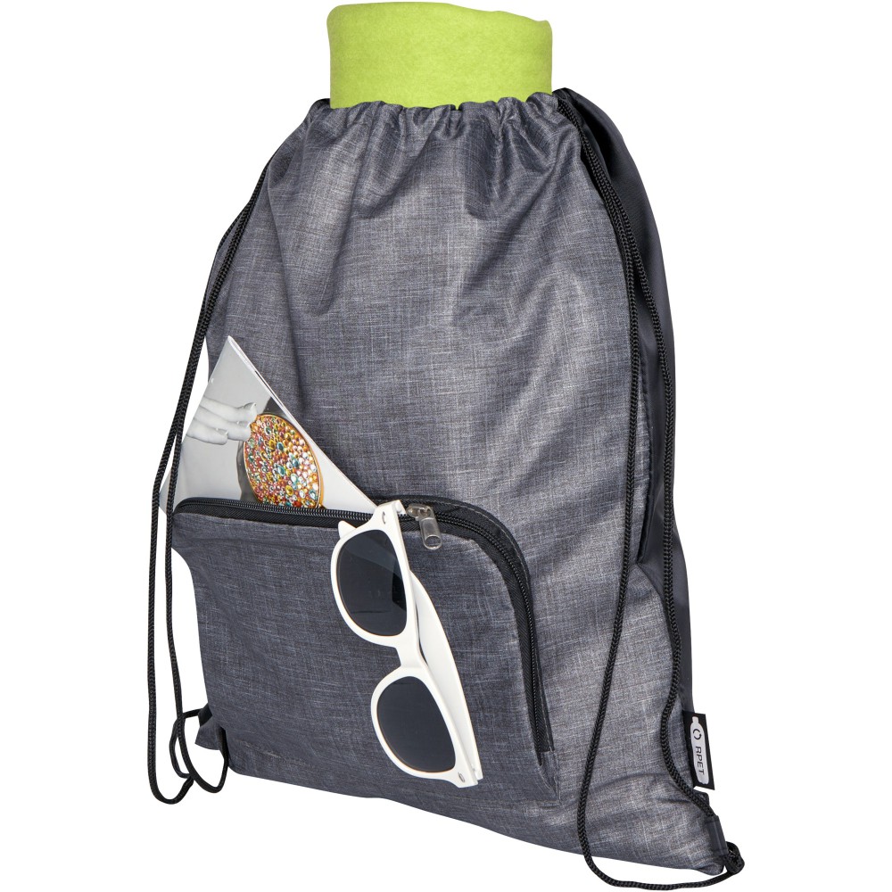 Az Ash összehajtható, újrahasznosított húzózsinóros táska egy cipzáras elülső rekesszel és egy cipzáras elülső zsebbel rendelkezik, amelybe a táska könnyen összecsukható a könnyű szállítás és tárolás érdekében.