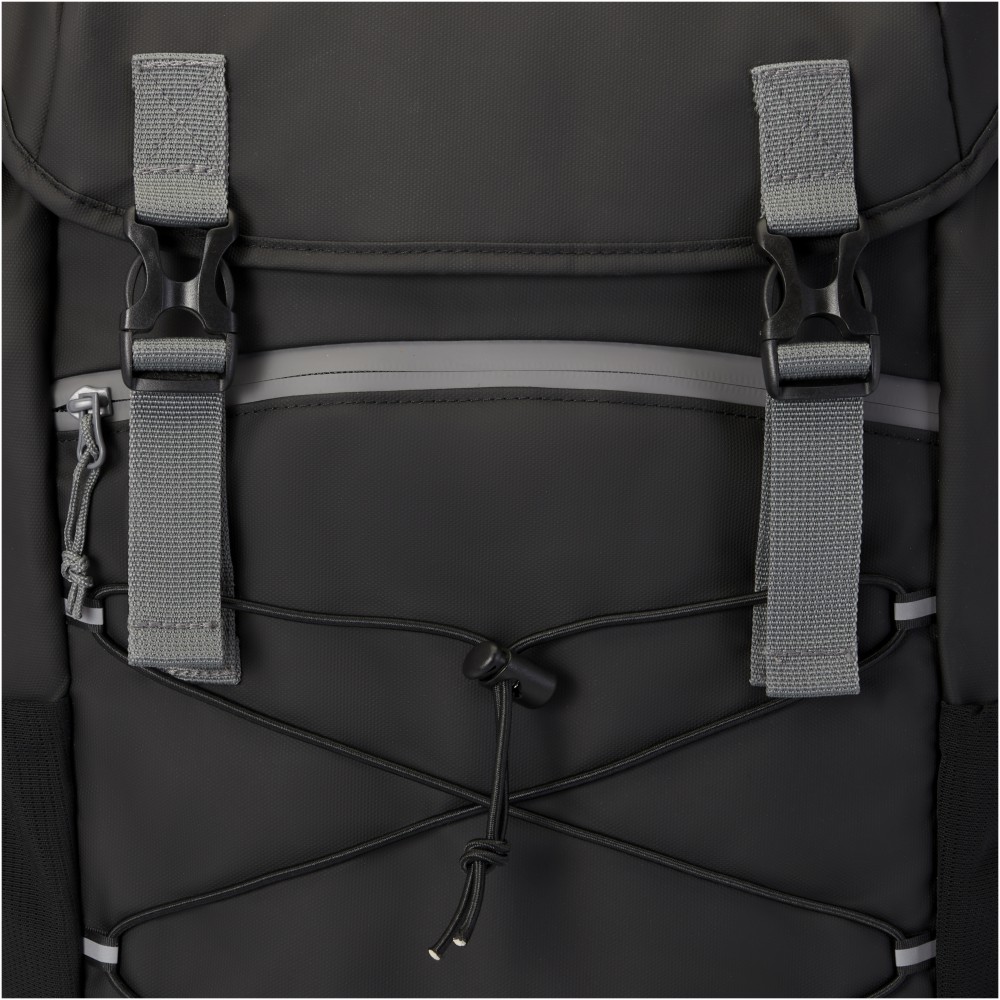 Vízálló laptop hátizsák GRS tanúsítvánnyal rendelkező újrahasznosított anyagokból, beleértve a cipzárakat is. Tágas, 15,6 -os laptoprekesszel rendelkezik, zsinórral és állítható csatokkal, hogy maximalizálja a tárolóhelyet a fedlap alatt. Ez a hátizsák több zsebbel rendelkezik, köztük egy cipzáras elülső zsebbel, rugalmas húzózsinórral a tároláshoz és rendszerezéshez, valamint fényvisszaverő csíkokkal a láthatóság érdekében. A formázott és párnázott hátlapnak és az állítható mellkaspántnak köszönhetően még teljes terhelés esetén is kényelmesen hordozható. A GRS újrahasznosított anyagai közé tartozik a főszövet, a bélés, a hevederek és a cipzárak. Űrtartalom: 23 liter. PVC-mentes.
