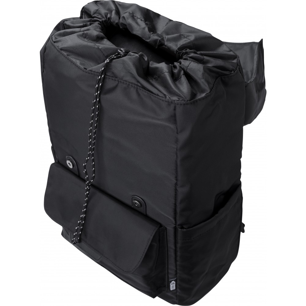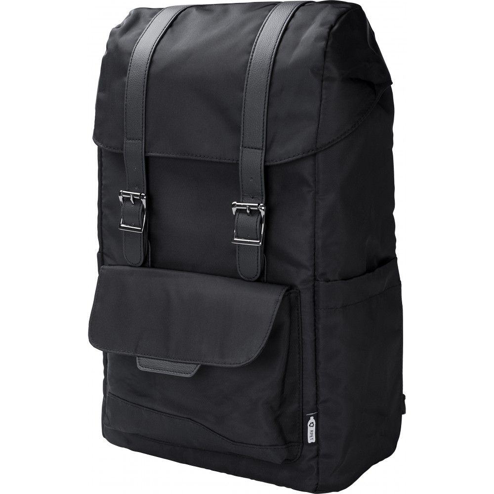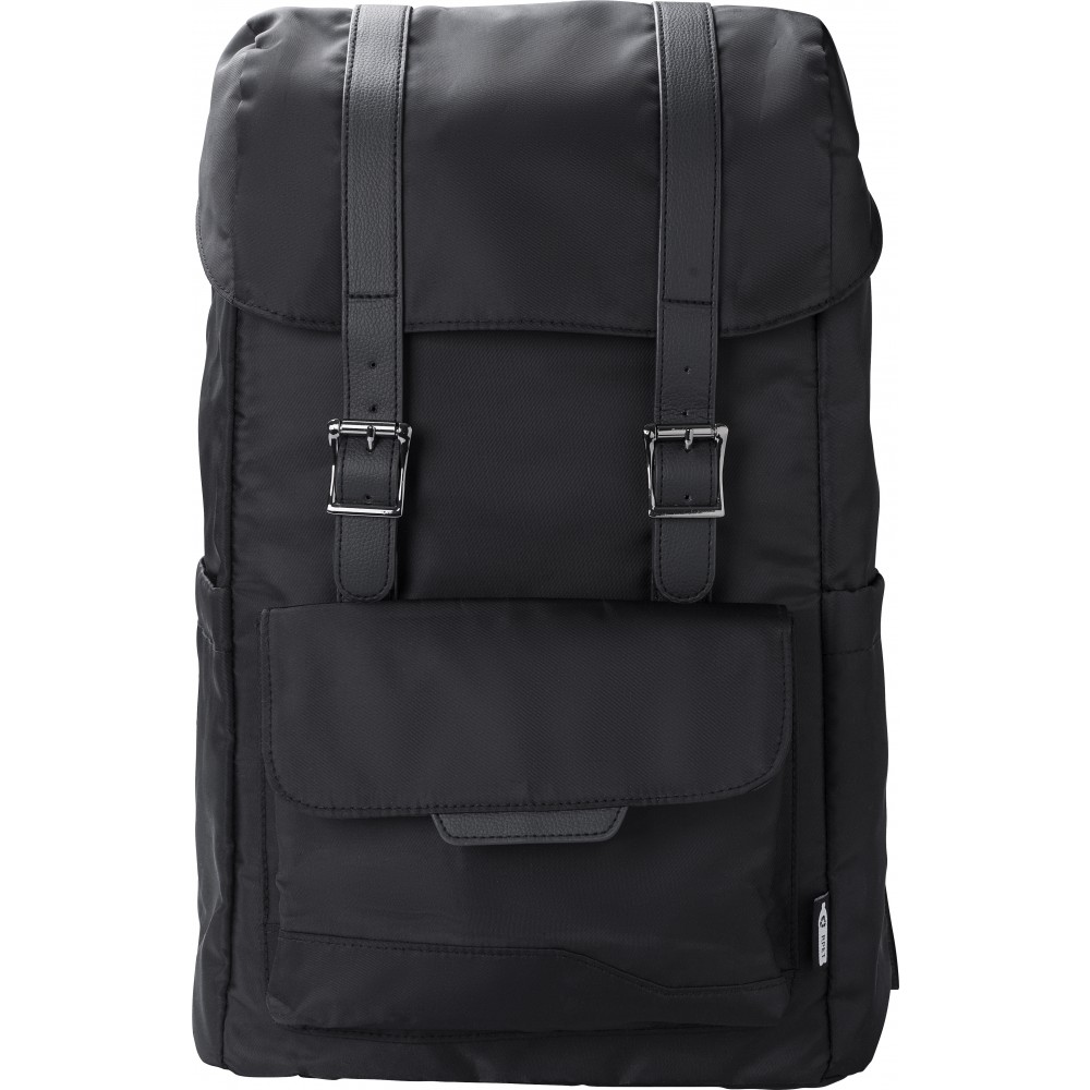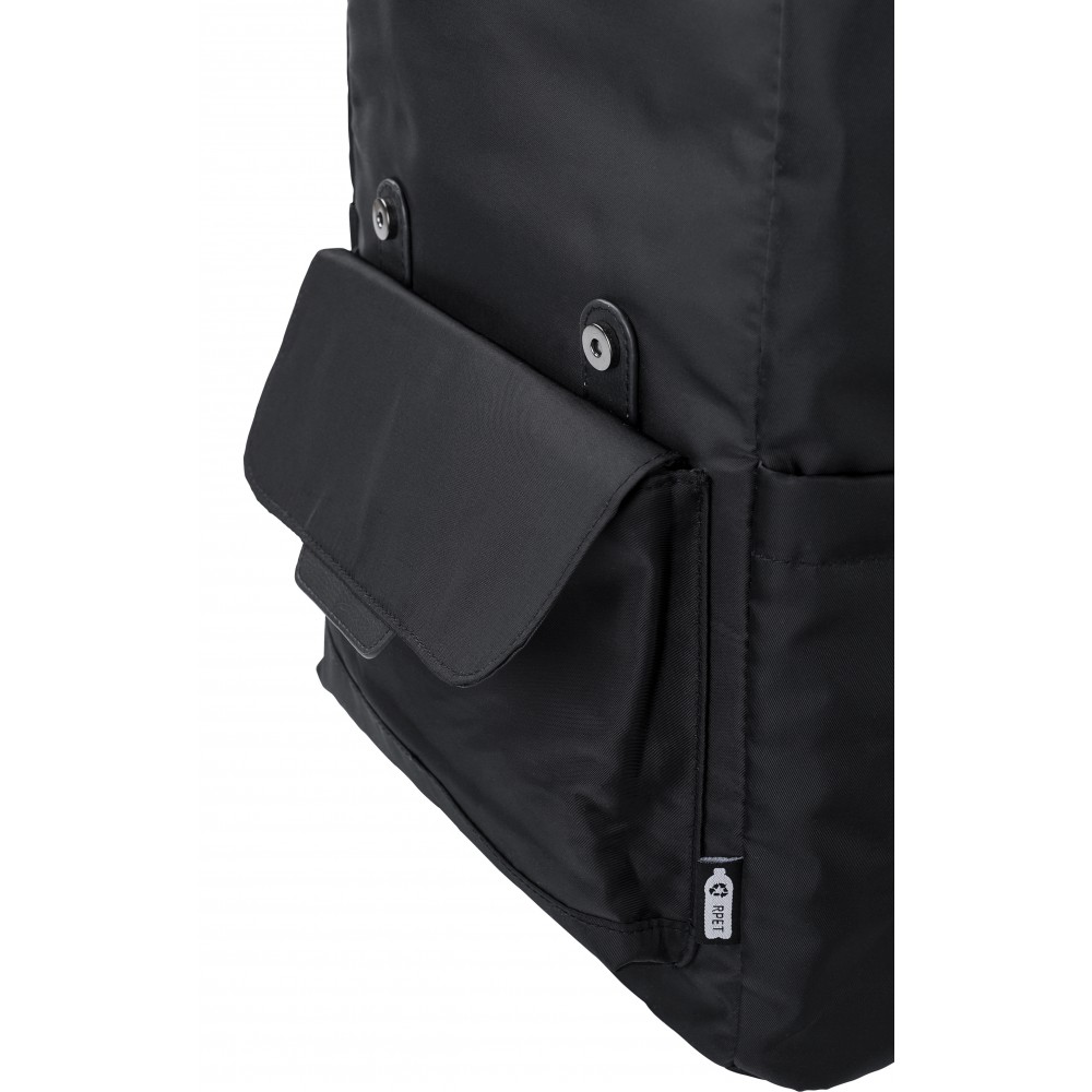 Hátizsák. Oldalt palacktartók, elöl mágneses záródású zseb. A belső zseb zsinórral zárható, belül laptoptartó és normál zseb található (15"-es laptop számára). A hátoldalon pánt található a bőrönd húzókájára való rögzítés érdekében. Vízlepergető bevonat. 290T twill poliészter RPET.