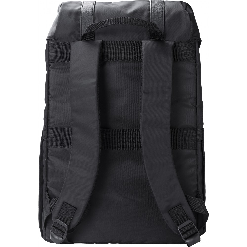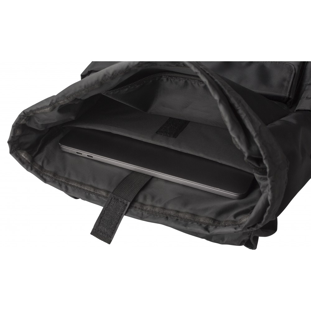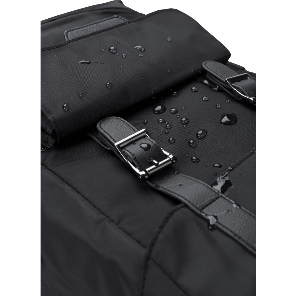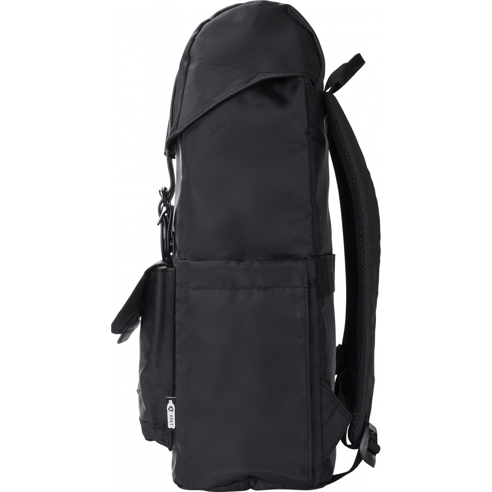 Hátizsák. Oldalt palacktartók, elöl mágneses záródású zseb. A belső zseb zsinórral zárható, belül laptoptartó és normál zseb található (15"-es laptop számára). A hátoldalon pánt található a bőrönd húzókájára való rögzítés érdekében. Vízlepergető bevonat. 290T twill poliészter RPET.