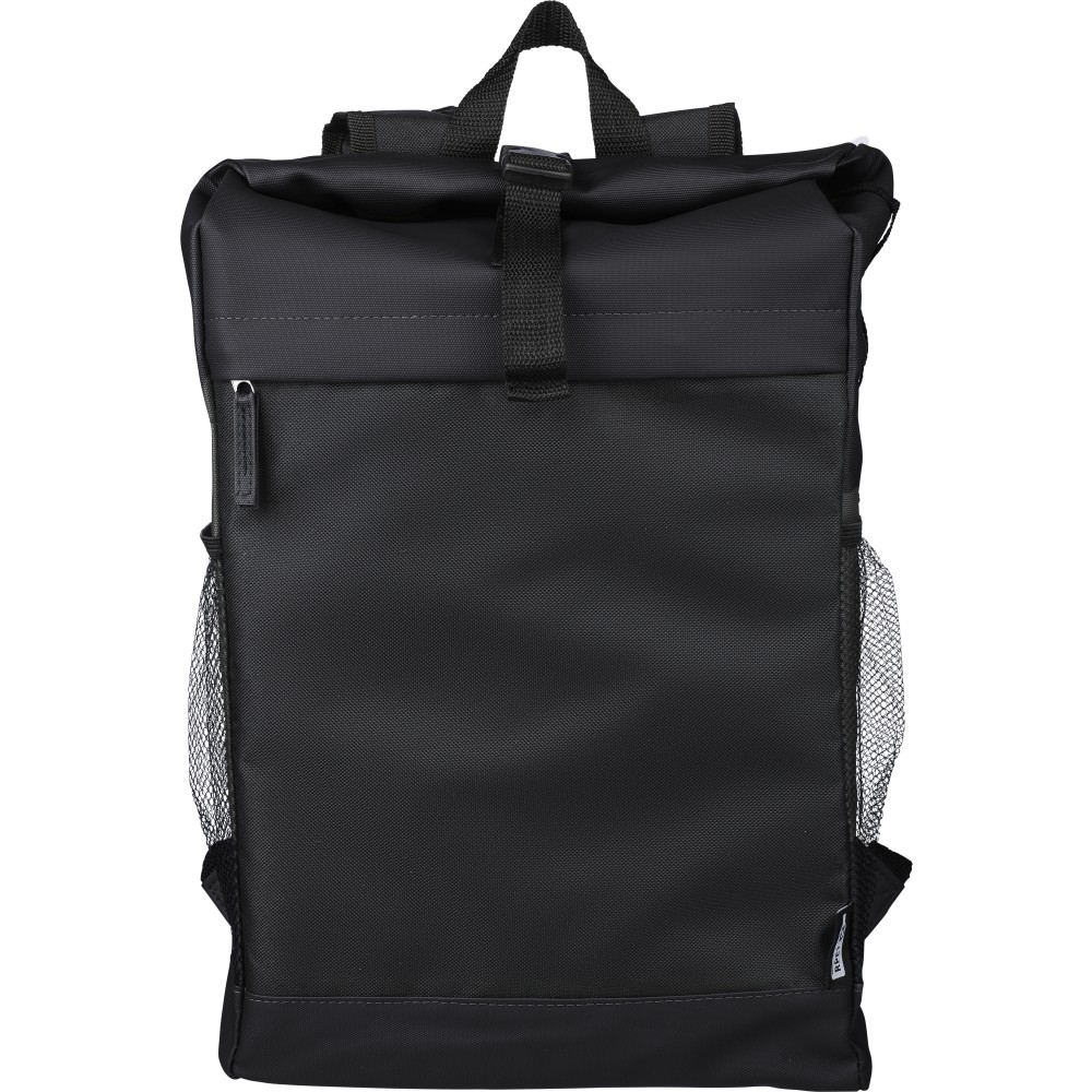 600D rPET poliészter roll-top hátizsák. PU bevonat teszi vízlepergetővé. Rejtett cipzáras első zsebbel, hálós oldalzsebekkel, 15 -es laptop számára kialakított tárolórésszel, 5 tárolórekesszel, állítható vállpánttal. Kapacitása 25 liter, teherbírása 15 kg. Oldalán rPET címkével.