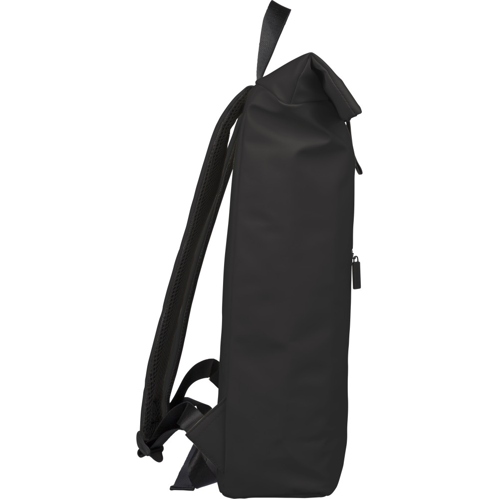 Újrahasznosított PU anyagból készült hátizsák 19 literes űrtartalommal, rolltop záródással és tépőzáras rögzítéssel. Elülső cipzáras zsebbel, 16 hüvelykes laptoprekesszel, 210D újrahasznosított béléssel, állítható szellőző vállpántokkal és felső fogantyúval rendelkezik. A belső címkén újrahasznosított alapanyagra utaló jelölés található.