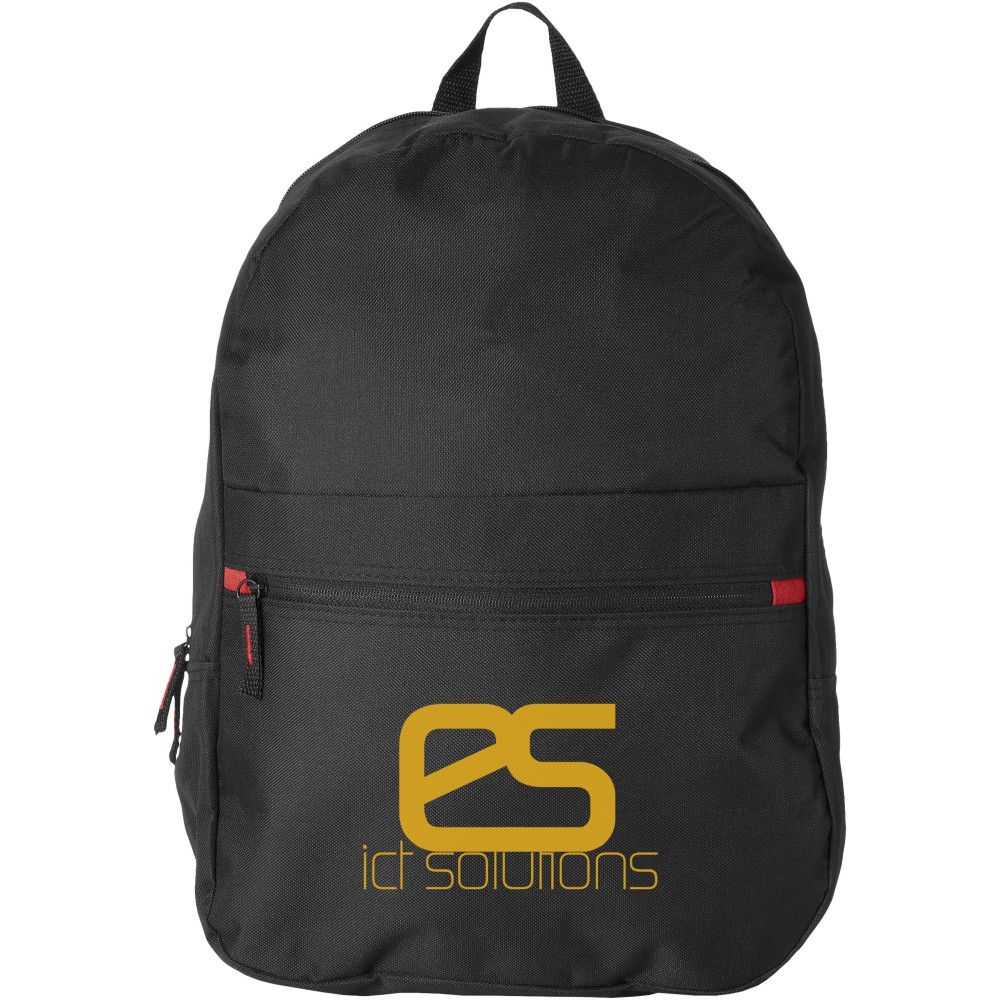 Hátizsák piros díszítésekkel, cipzáras fő rekesz, elülső cipzáras zseb és elülső zseb tépőzárral. Állítható párnázott válllpántok és megerősített felső hordfogantyú. 600D poliészter.