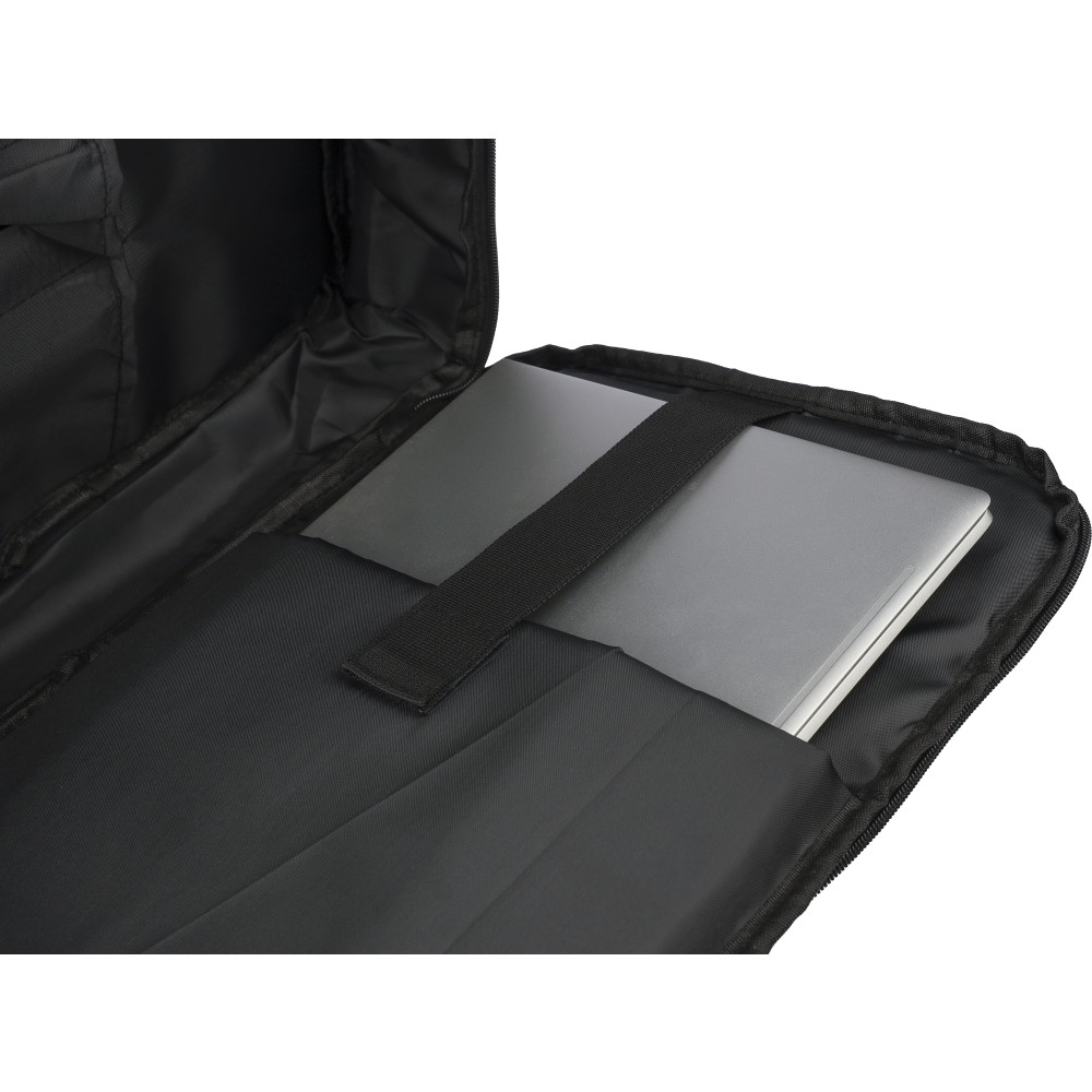 Laptophátizsák 300D rPET poliészter anyagból, 210D rPET béléssel. Egy nagy cipzáras rekesszel, számtalan belső zsebbel, tépőzáras laptoptartó zsebbel 15"-es laptop számára és 12 literes űrtartalommal. Megerősített, szellőző hátrésszel, állítható vállpánttal, oldalsó hordozófüllel és gurulóstáskára való felhelyezésre alkalmas pánttal. Teherbíró képesség: 10 kg.