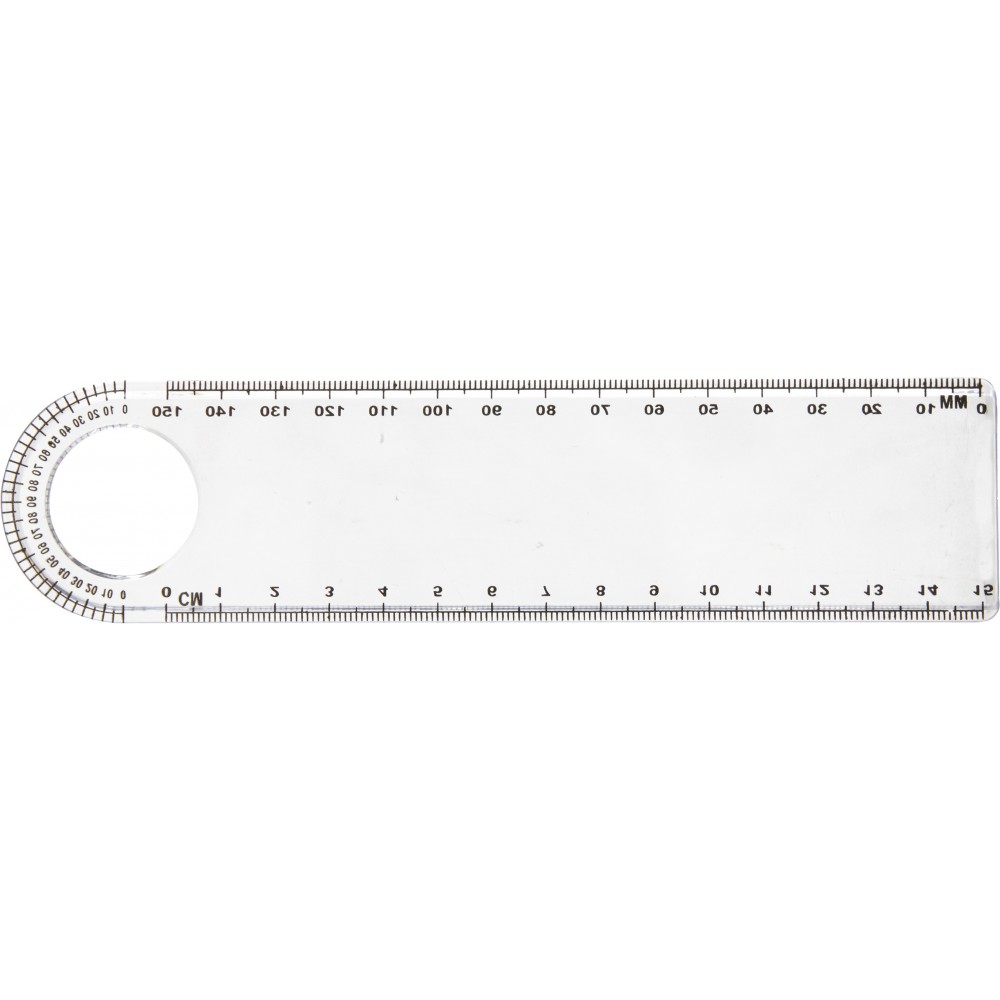 Átlátszó, 15 cm-es vonalzó nagyítóval és szögmérővel. Műanyag.