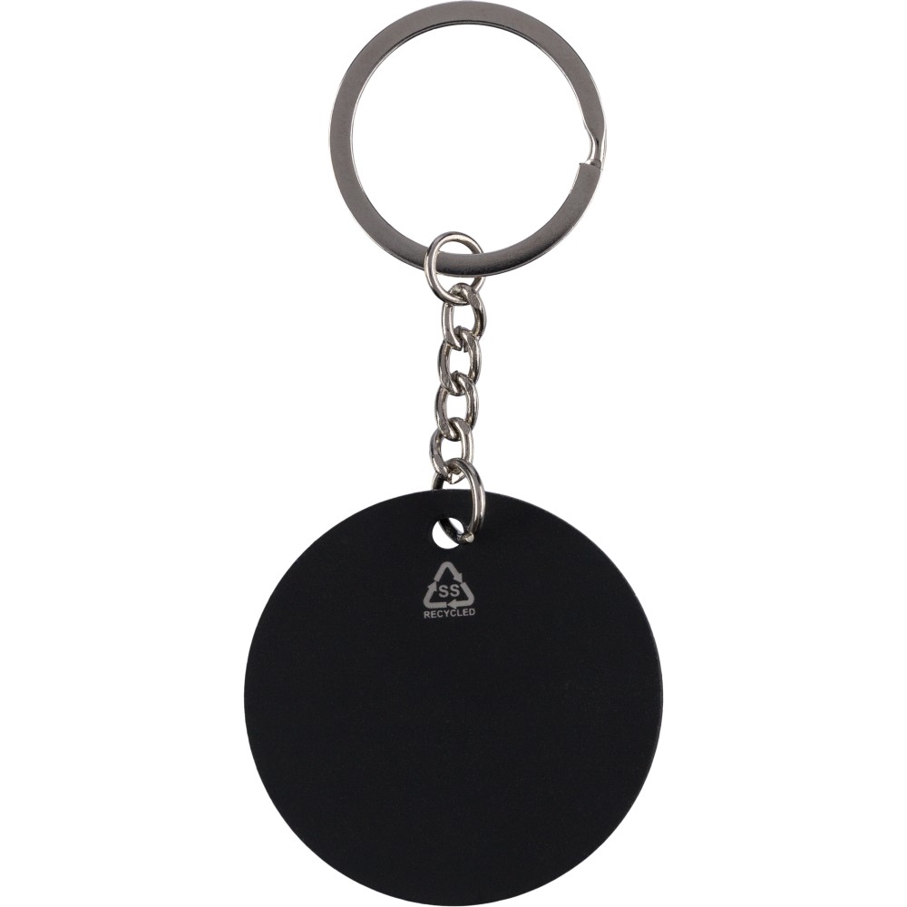 Újrahasznosított rozsdamentes acélból készült, gumírozott felületű, kerek kulcstartó fém karikával. A kulcstartón gravírozott recycled (újrahasznosított) alapanyagra utaló logó található, amely gravírozás után fényes, tükörszerű hatást mutat. Egyenként kraft papírtasakba csomagolva.