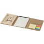 Irodaszermappa tartalma: negyven lapos jegyzetfüzet, bambusz vonalzó (15 cm), karton toll műanyag heggyel, klipsszel és nyomógombbal, kék tollbetéttel, valamint két ceruza, hegyező, radír, öntapadó jelölők (25 lap színenként) és egy belső zseb. Fa, karton, gumi, EVA, papír.