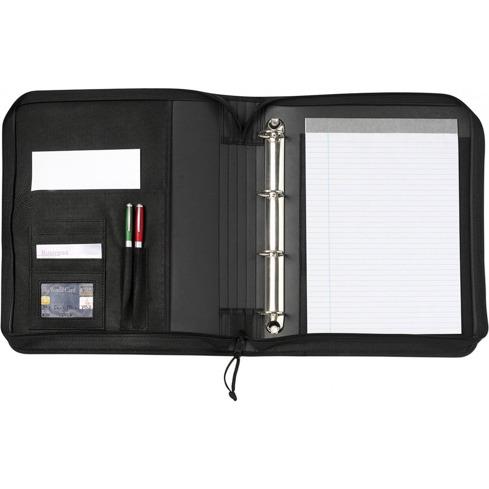 A4-es cipzáras, gyűrűs mappa és irattáska jegyzettömbbel, 600D poliészter anyagból. A tollat nem tartalmazza.