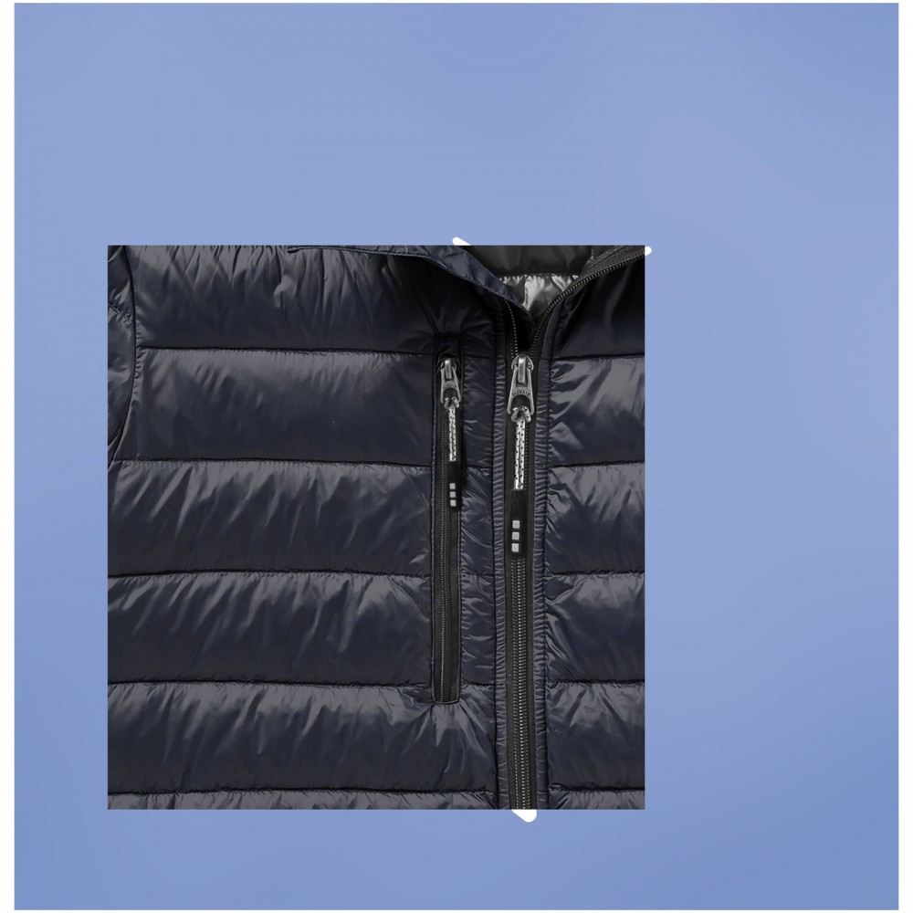 Normál szabásvonal. Pehelybiztos anyag. Cipzáros mell- és oldalzsebek. Szél elleni állvédő betét a nyaknál. Gumis szegély az aljon és a karöltőben. Vízlepergető, lélegző és szélálló. Hátul fényvisszaverő logónyomat . Könnyen megfogható cipzárhúzókák . A RedDot Design Díj nyertes Scotia dzsekivel megegyező minőség. 100% nylon, szőtt anyag, dupla vízlepergető bevonat, 20D. 80% pehely és 20% toll töltet.