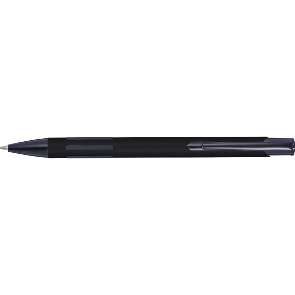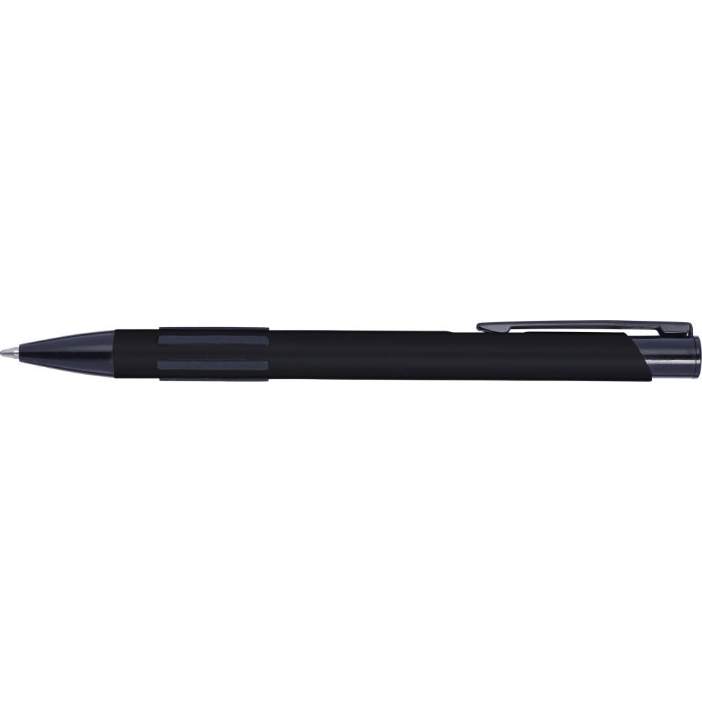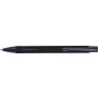 Golyóstoll lakkozott felülettel, nyomógombbal, kék tollbetéttel. A klipsz, a hegy és a gumis fogófelület színe illeszkedő fekete., alumínium, PVC, gumi