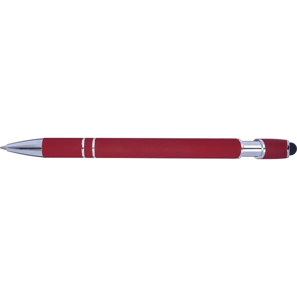Golyóstoll kék tollbetéttel, gumis felülettel és érintővel kapacitív képernyőkhöz. Kék tollbetéttel. A hegy és a klipsz ezüst színű műanyag. ABS, alumínium.