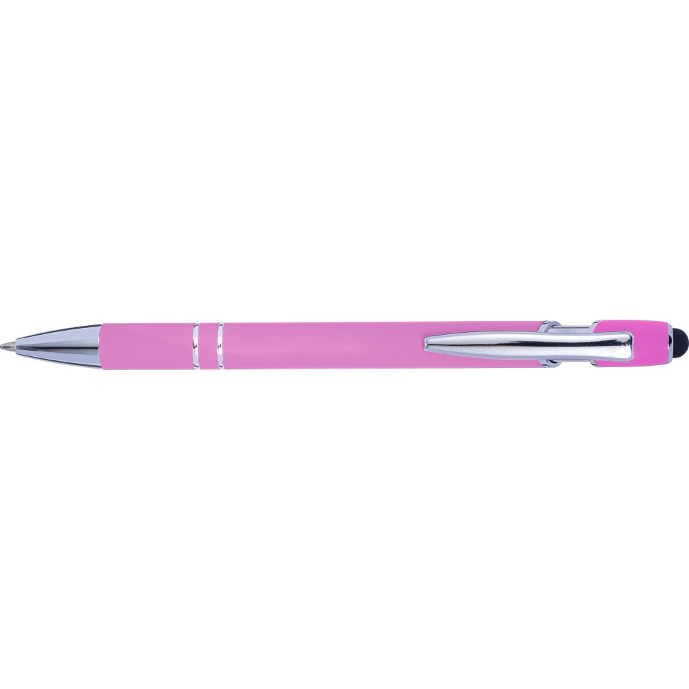 Golyóstoll kék tollbetéttel, gumis felülettel és érintővel kapacitív képernyőkhöz. Kék tollbetéttel. A hegy és a klipsz ezüst színű műanyag. ABS, alumínium.