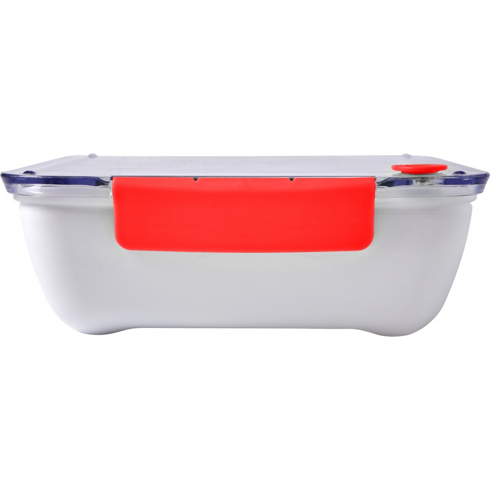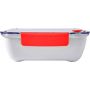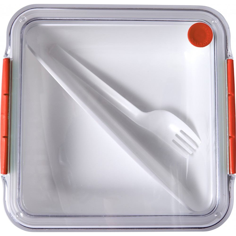 Ételdoboz, mely kenyér tárolására is kiválóan alkalmas. Átlátszó fedéllel, szilikon csatokkal, kivehető, háromszög alakú belső tárolóval, villával. 920 ml. BPA-mentes műanyag.
