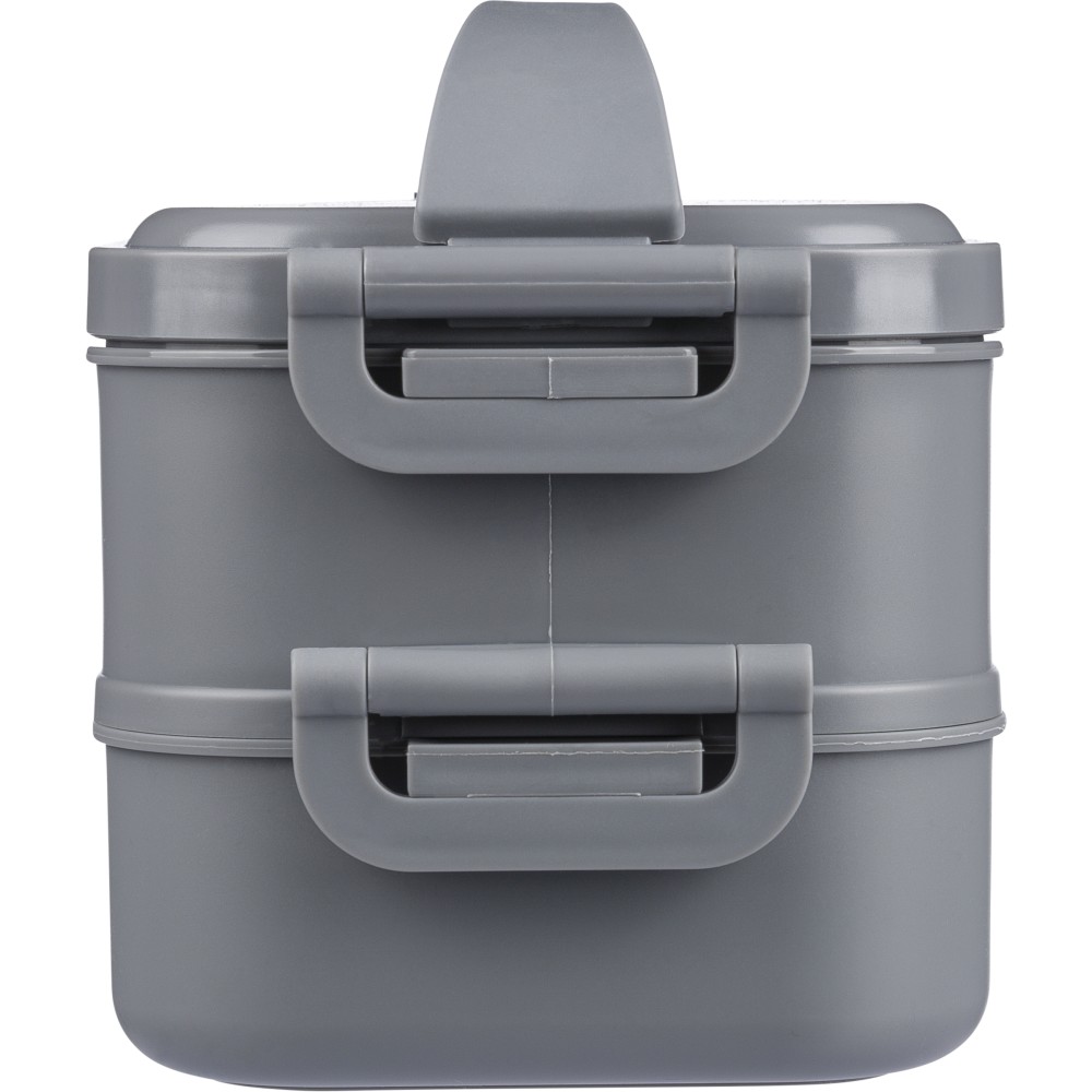 1600 ml-es PP ételtároló doboz 2 db, egyenként 800 ml-es résszel. Szilikon szeleppel a mikrohullámú sütőben történő melegítéshez, csatos záródással és szilikon hordozófüllel. Mosogatógépben tisztítható.