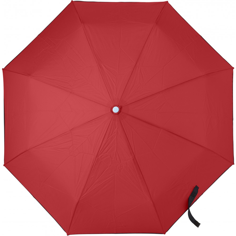 Összecsukható automata esernyő fém vázzal, üvegszálas bordákkal, műanyag fogóval, tokkal.