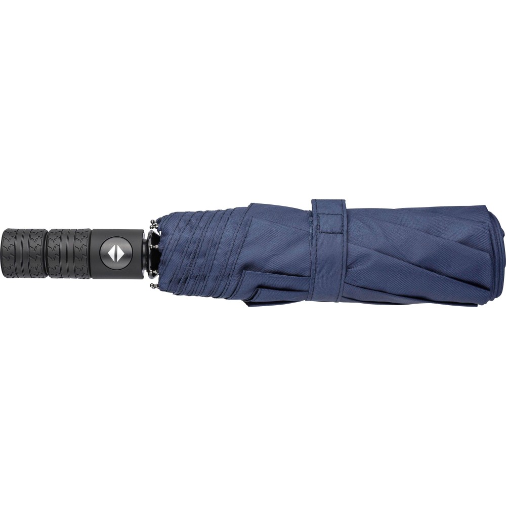 Automata nyitású és zárású, összecsukható esernyő 8 panellel, tokkal. Nyele gumis mintázatú, az autók abroncsára emlékeztet. Vászna RPET pongee anyag. Mérete: 21".