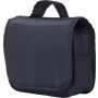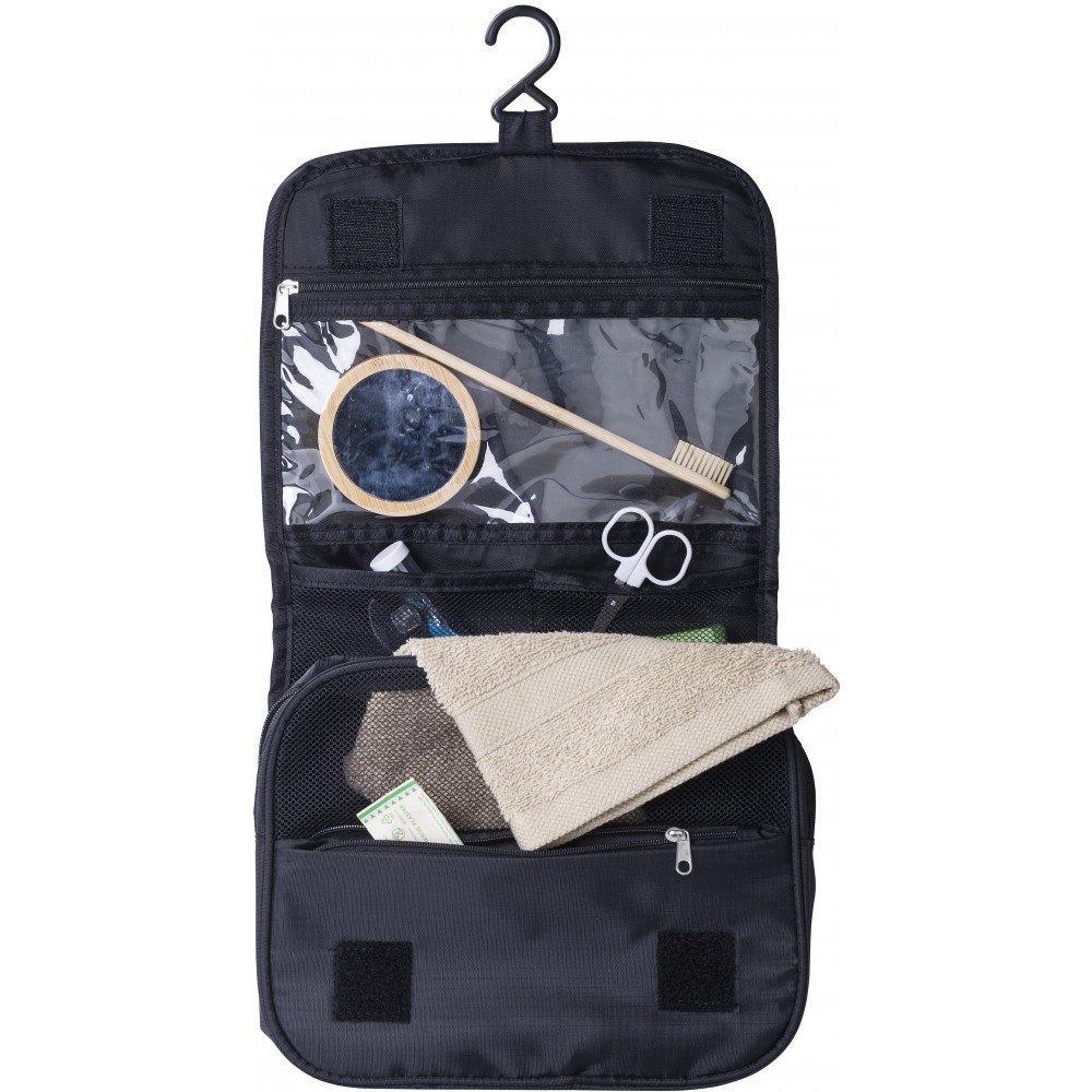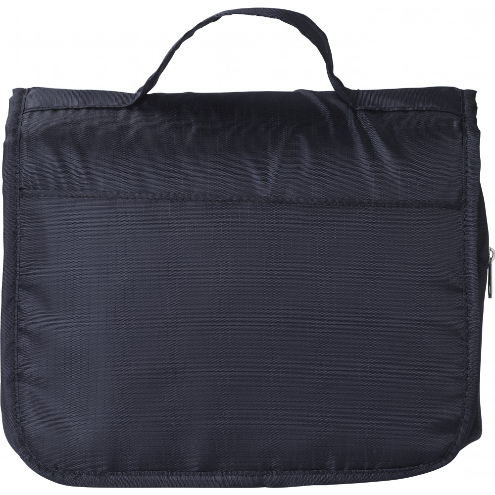 Piperetáska akasztóval. Kinyitva felül átlátszó zseb. Belül egy nagy cipzáras hálós zseb és egy kis zárt cipzáras zseb található. Hátoldalán egy rekesz. Rövid fogantyú. Ripstop 210D.