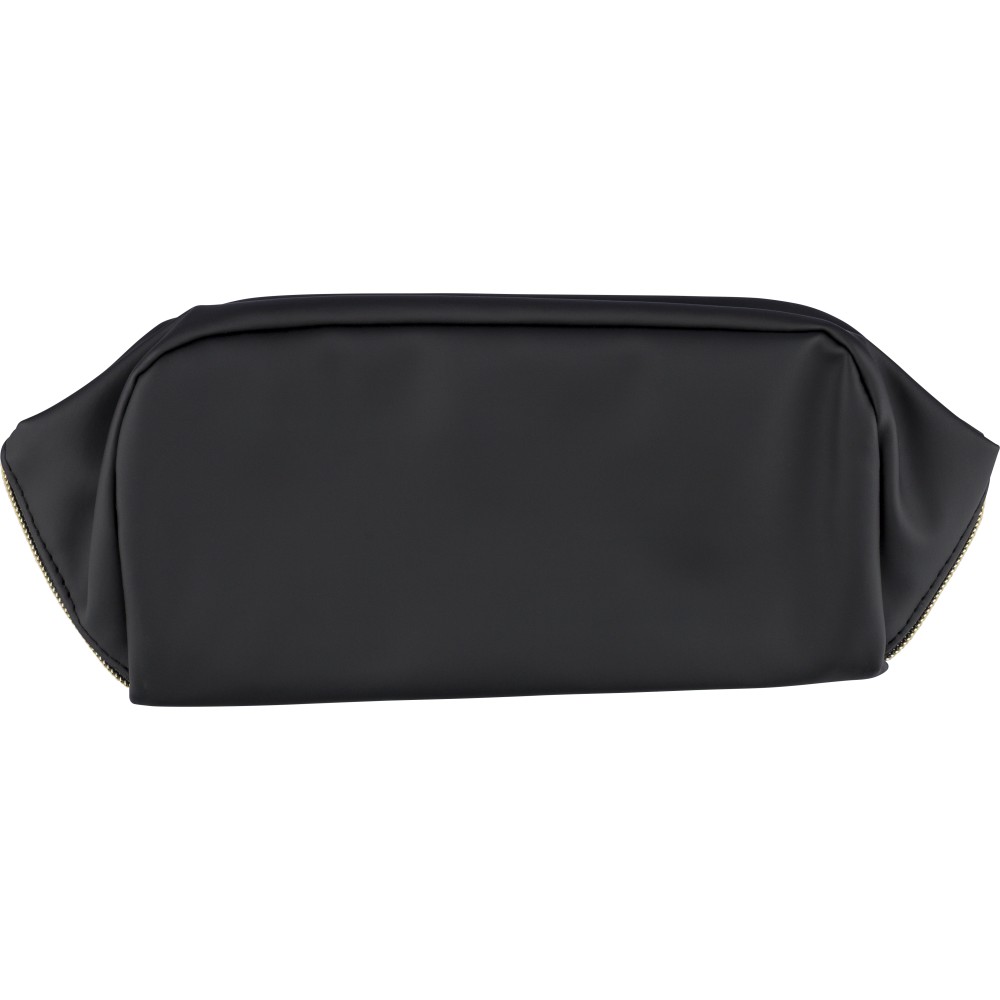 Újrahasznosított PU anyagból készült neszesszer középen elhelyezett cipzárral a széles nyithatóság érdekében. Rövid fogantyúval, tágas belső térrel és négy rekesszel, beleértve egy belső cipzáras zsebet. 210D újrahasznosított béléssel készült, belsejében egy újrahasznosított alapanyagra utaló címkével.