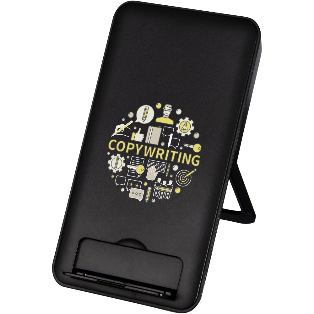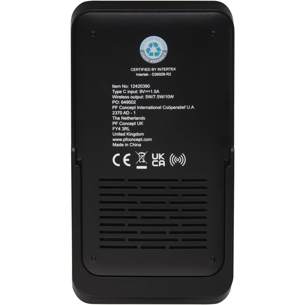 RCS tanúsítvánnyal rendelkező újrahasznosított ABS műanyagból készült vezeték nélküli töltőpad. Telefonállványként is funkcionál, így tökéletes asztali kiegészítő. Az RCS (Recycled Claim Standard) egy szabvány a termék újrahasznosított tartalmának ellenőrzésére a teljes ellátási láncban. Csatlakoztassa a töltőpadot egy számítógéphez vagy laptophoz, és helyezze az eszközt a tetejére a töltés megkezdéséhez. A vezeték nélküli kimenet 10 W (max.) a gyors töltés érdekében. Kompatibilis az összes Qi eszközzel (iPhone 8 vagy újabb és Android készülékek, amelyek támogatják a vezeték nélküli töltést). Ajándékdobozban, használati útmutatóval szállítjuk (mindkettő fenntartható anyagból készült).