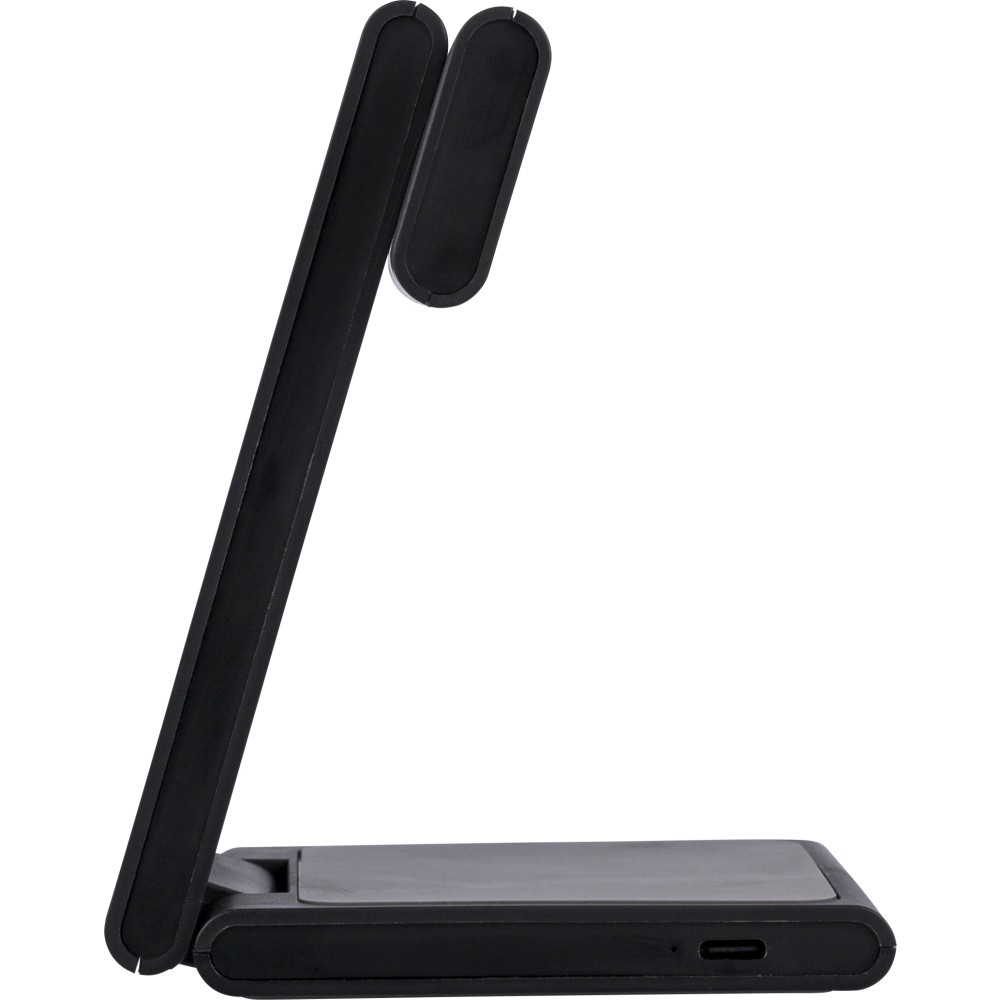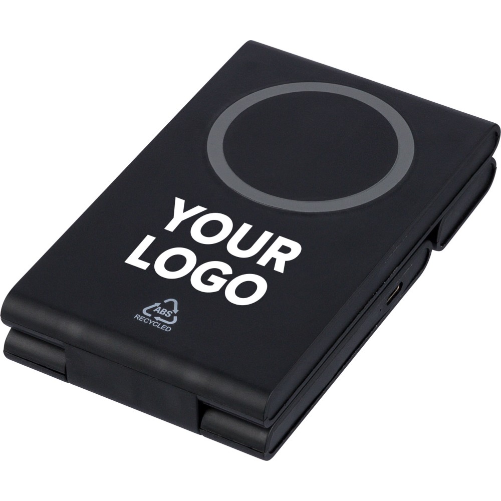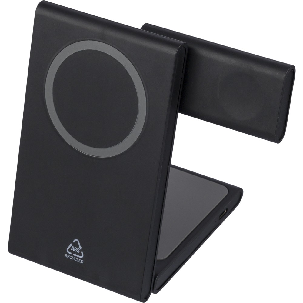 Újrahasznosított ABS-ből készült 3 az 1-ben mágneses töltő, amely 15W teljesítménnyel telefont, 5W-tal AirPods fülhallgatót, valamint 2W-tal iWatch okosórát tölt. Ultralapos kialakítású, felhajtható támasztékkal. Bemenet: 5V/3A vagy 9V/3A. A terméktesten recycled (újrahasznosított) alapanyagra utaló logó található. Barna dobozba csomagolva.