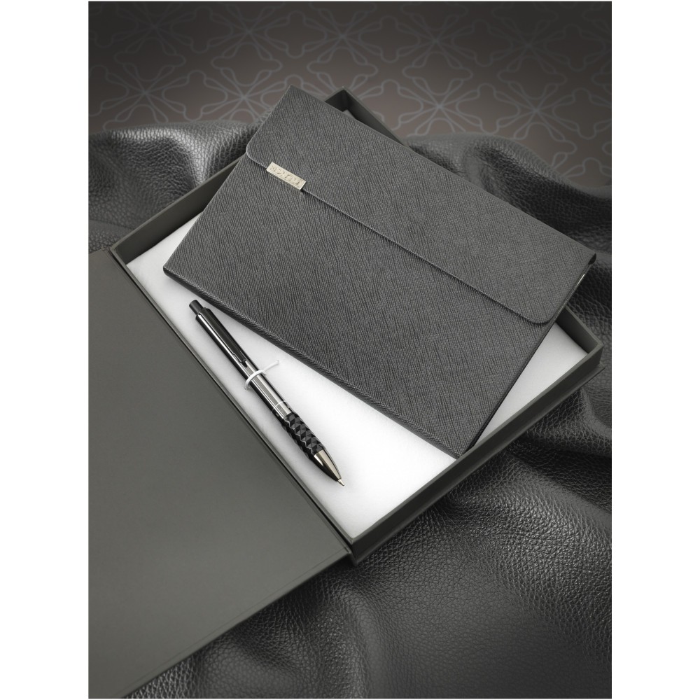 Lenyűgöző ajándék, amely tartalmaz egy A5 méretű thermo PU fedelű füzetet 80 db krémszínű vonalas lappal, fekete könyvjelzővel, mágneses záródással, valamint egy golyóstollat Luxe díszdobozban. Csomagolása Luxe ajándékdoboz. PU.