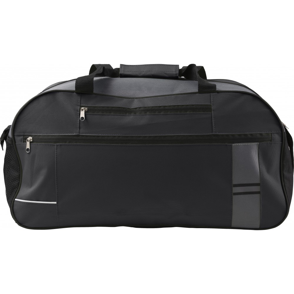 Utazótáska több cipzáros zsebbel, fényvisszaverő csíkkal, állítható vállpánttal. 600D poliészter.