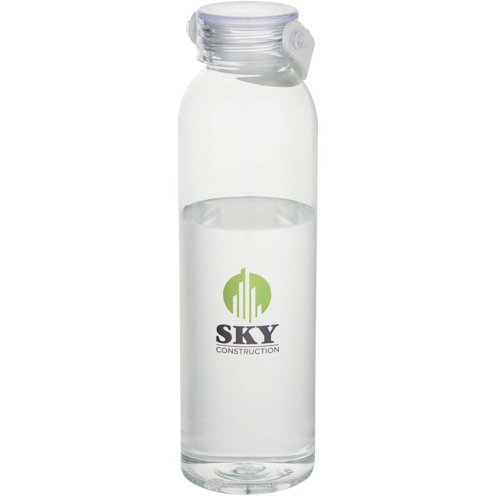 RCS tanúsítvánnyal rendelkező RPET-ből készült kulacs, praktikus szilikon hordozófüllel. Megfelel az EFSA által jóváhagyott PET-újrahasznosítási eljárásnak. Űrtartalom: 630 ml.